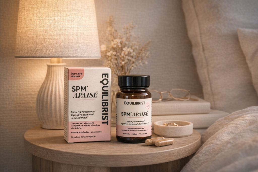 SPM Apaisé d’Equilibrist est un complément alimentaire expert dédié au soulagement des symptômes du syndrome prémenstruel*. Sa formule associe plantes ciblées, vitamines et minéraux pour soutenir l’équilibre hormonal. Compatible avec tous les types de contraception, il se prend en cure quotidienne d’au moins trois mois. Alchémille, achillée millefeuille et mélisse s’allient aux vitamines B et au zinc pour accompagner le cycle avant et pendant les règles. Un essentiel bien-être pour une routine féminine plus sereine.