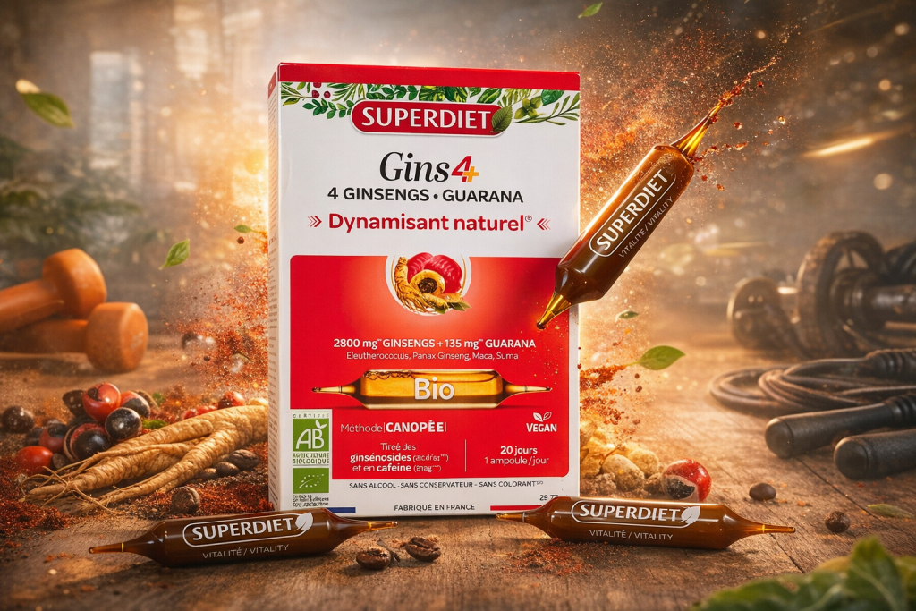 Parmi ses formules phares axées sur l’énergie et la forme, Superdiet propose Gins4+, un complément naturel conçu pour soutenir la vitalité quotidienne et apporter un coup de boost tonique. Chaque ampoule associe quatre types de ginsengs* à du guarana, source naturelle de caféine. Ce mix bio stimule l’énergie, renforce les défenses naturelles et combat la fatigue passagère. Issue de l’agriculture biologique, vegan et fabriqué en France, cette formule s’inscrit dans l’approche phyto-naturelle de la marque, axée sur l’efficacité des plantes adaptogènes pour un bien-être durable.