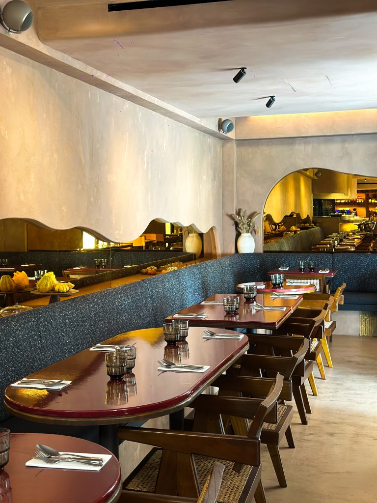 Chez Colita, la décoration fait partie intégrante de l’ADN du lieu. Sur la grande terrasse aux fauteuils orange ou dans la longue salle aux tons terre cuite, l’ambiance se veut chaleureuse et décontractée. L’agence niçoise Bleu Gris signe un décor inspiré de l’art précolombien et des haciendas traditionnelles, mêlant matières brutes, textures, poteries artisanales et bois patinés. Les murs, façonnés par la terre, dialoguent avec les jarres étrusques du bar ouvert sur la cuisine. La lumière, savamment tamisée, installe une atmosphère à la minéralité douce, enveloppante et sensuelle. Cuisine ouverte, places au comptoir, proximité avec la flamme, ici, le feu est visible, audible, presque palpable.