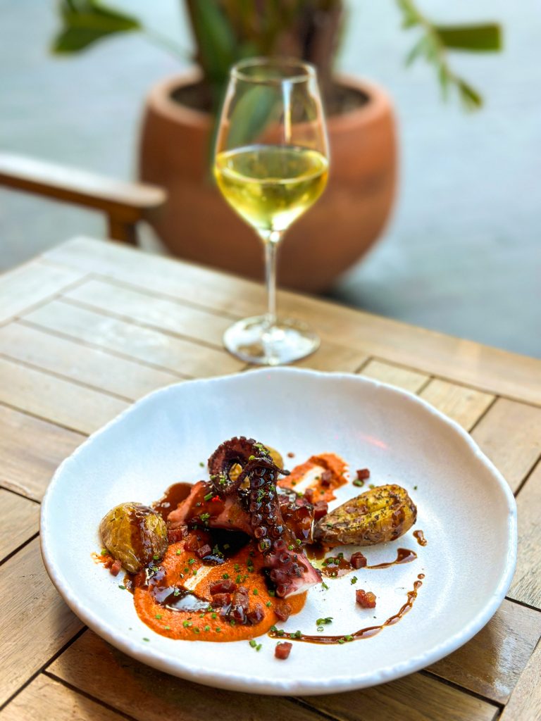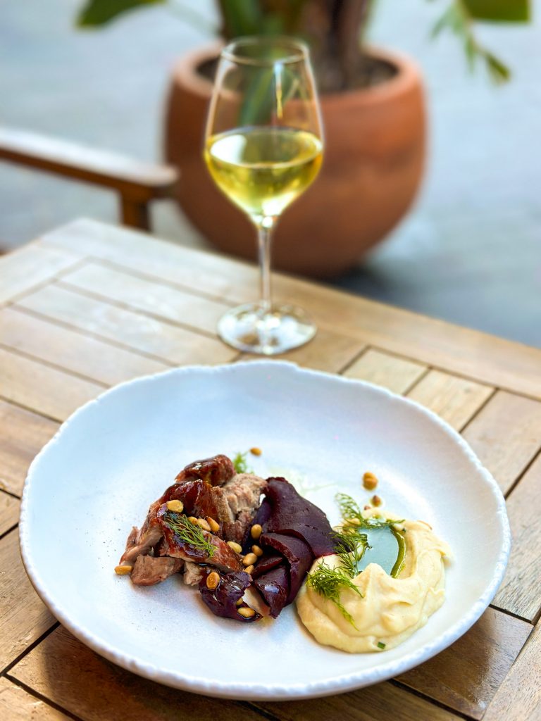 Les plats confirment la maîtrise du feu. Le poulpe, saisi à la flamme, se distingue par sa texture et s’accompagne d’une sauce romesco relevée de spianata piquante. La pluma de cochon, fondante, s’accorde à une purée de céleri-rave, un pesto à l’aneth, un jus de viande concentré et une betterave subtilement travaillée.