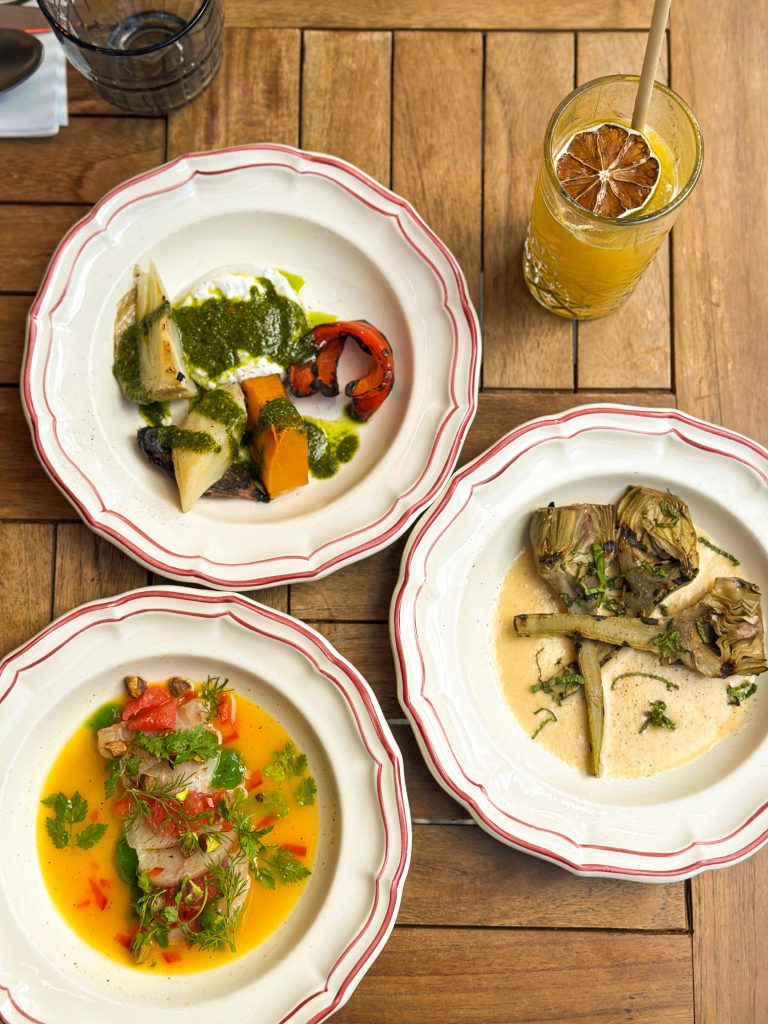 Installés sur la terrasse baignée de lumière, notre expérience débute par deux mocktails Son Tu Passion, clin d’œil à la mixologie colombienne, qui ouvrent le palais avec fraîcheur. La suite se construit autour d’entrées finement exécutées : un artichaut délicatement braisé, relevé par la douceur du lardo di Colonnata, un ceviche de poisson blanc aux notes tropicales de jus de mangue, de purée de kimchi et de pomelo, puis une assiette de légumes grillés accompagnés de burrata et de pesto, où la braise apporte profondeur et équilibre.