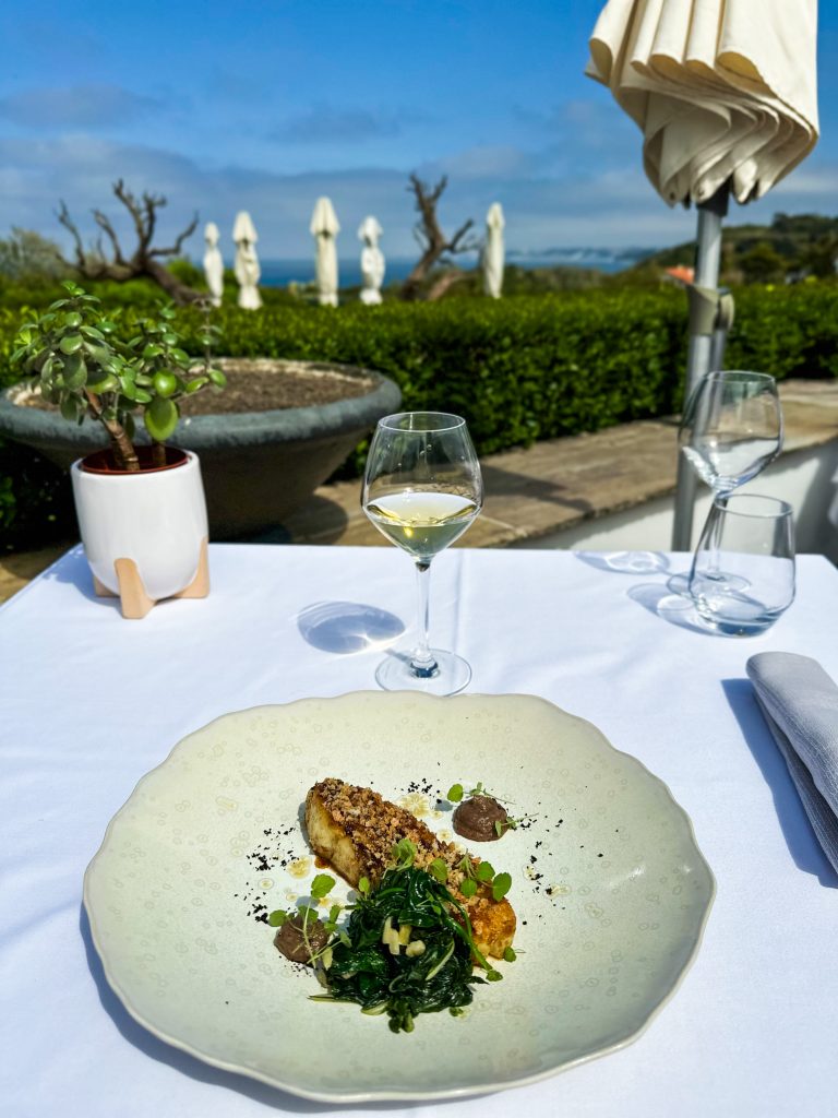 Sous le soleil basque, notre déjeuner débute par un foie gras des landes, relevé d’échalotes confites, d’anguille fumée et d’un vinaigre d’ail noir. Un verre de jurançon sec La Petite Hours 2022 vient en relever toutes les nuances. S’en suivent deux plats de caractère, un lieu jaune braisé à la sauce Genevoise et un carré de veau rôti, accompagné de champignons gratinés et d’une sauce marengo à la langue de veau.