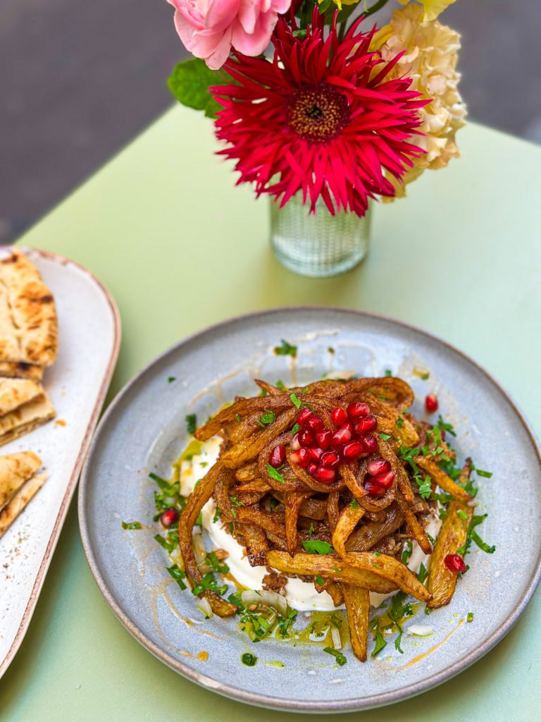 La promesse d’Evi Evane repose sur un sourcing sans compromis. Dina choisit les ingrédients comme on compose une partition. Sa cuisine fait la part belle aux produits frais français pour la viande et les légumes, aux pépites grecques importées directement de producteurs de confiance pour la feta, l’huile et les condiments. Parmi les références, on découvre la feta AOP Lytras, les huiles Terra di Sitia et Ladolea, les olives de Kalamata, les légumineuses Arosis, les œufs de cabillaud Maison Papas pour un tarama d’exception, et le pain pita d’un boulanger crétois ami. Dina a même développé son propre assemblage d’huile et une marque de feta, preuve de son engagement profond envers la traçabilité et la valorisation des terroirs.