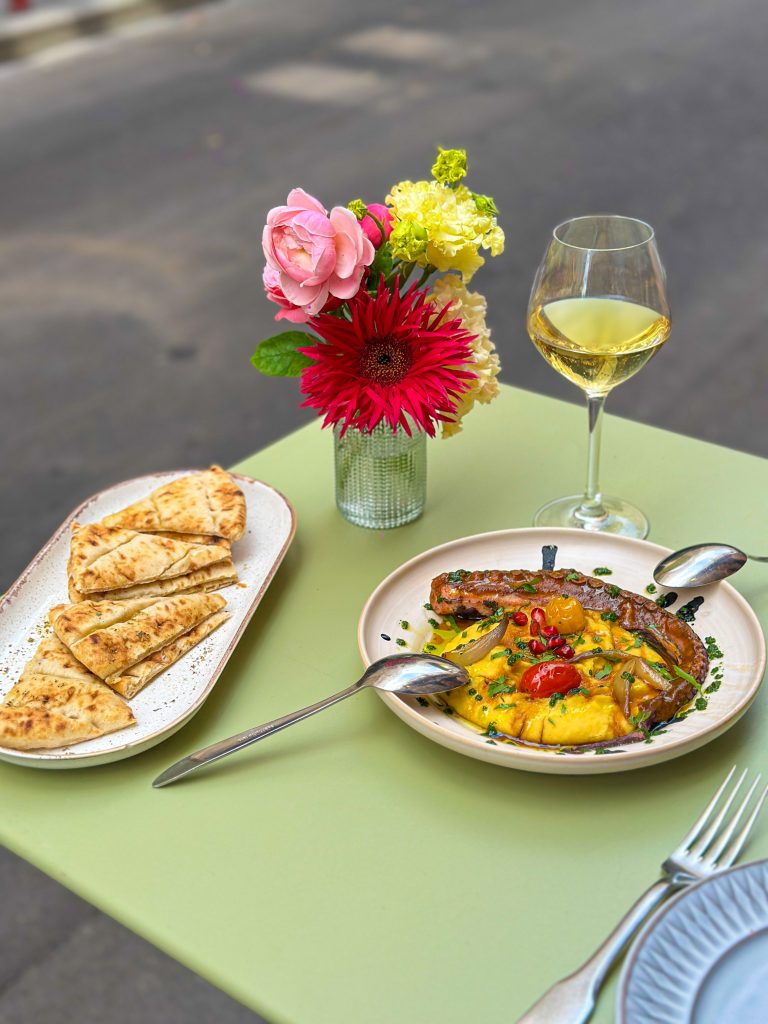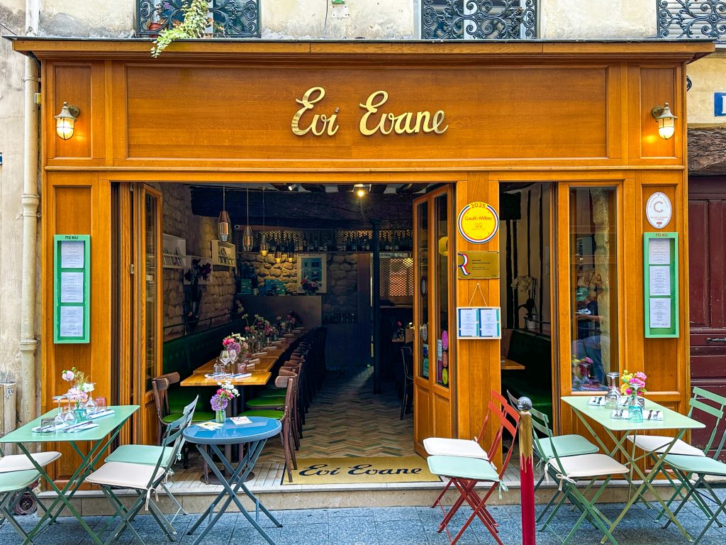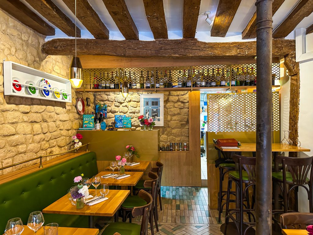 Nichée dans une petite rue pavée proche de Saint-Sulpice, l’adresse séduit d’emblée par son atmosphère chaleureuse. La salle, d’une vingtaine de couverts, rappelle l’esprit des tavernes chic avec ses murs de pierres apparentes, ses tables en bois, sa vaisselle colorée et ses assiettes de porcelaine artisanale. L’éclairage tamisé et les bouquets d’herbes aromatiques séchées composent un cadre apaisant, dans l’esprit d’une maison partagée, loin des clichés touristiques. L’intérieur d’Evi Evane nous invite chaleureusement au voyage, tandis qu’à l’extérieur, une petite terrasse permet de profiter des beaux jours.
