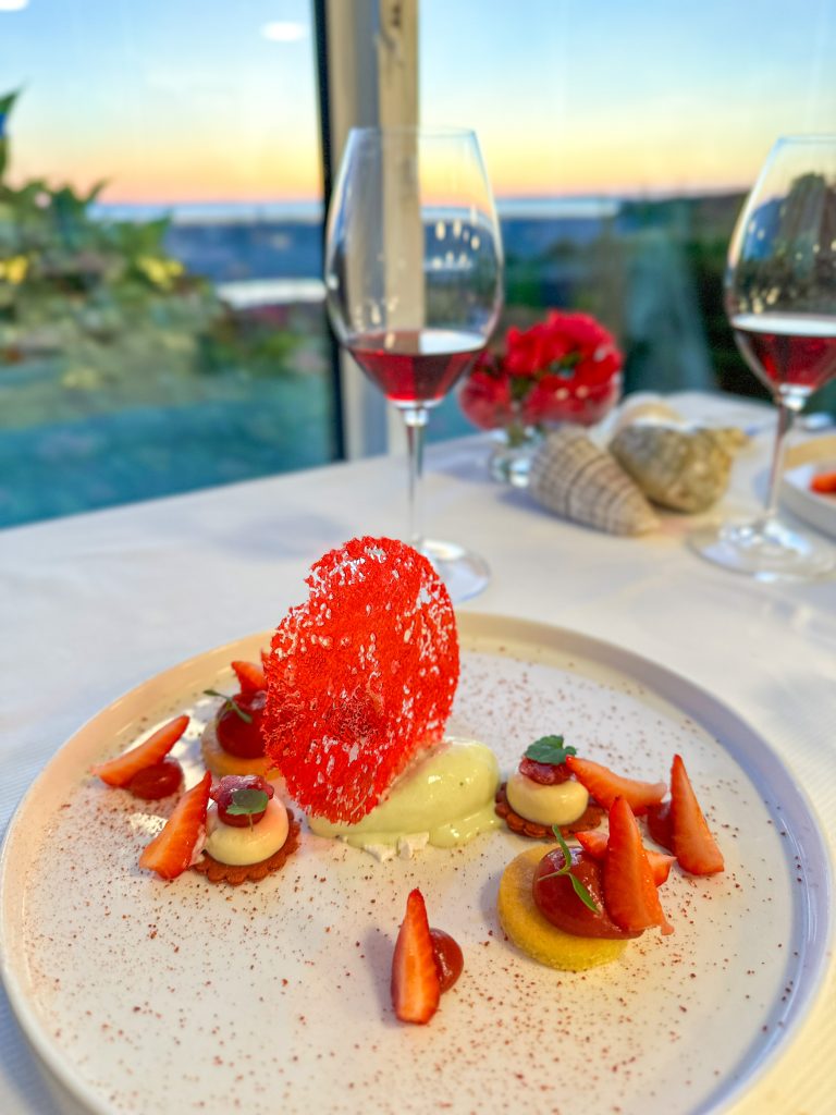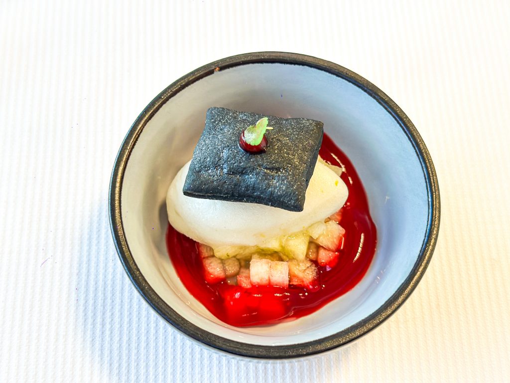 La partition sucrée, signée par le chef pâtissier Sonny Devanture, conclut ce festin en éclat. Le pré-dessert, léger et acidulé, marie une brunoise de pomme verte, sorbet citron, gelée d’hibiscus et coussin crémeux. Puis vient le dessert final avec l’union délicate de la fraise et du thé vert, relevée d’une crème glacée boisée.