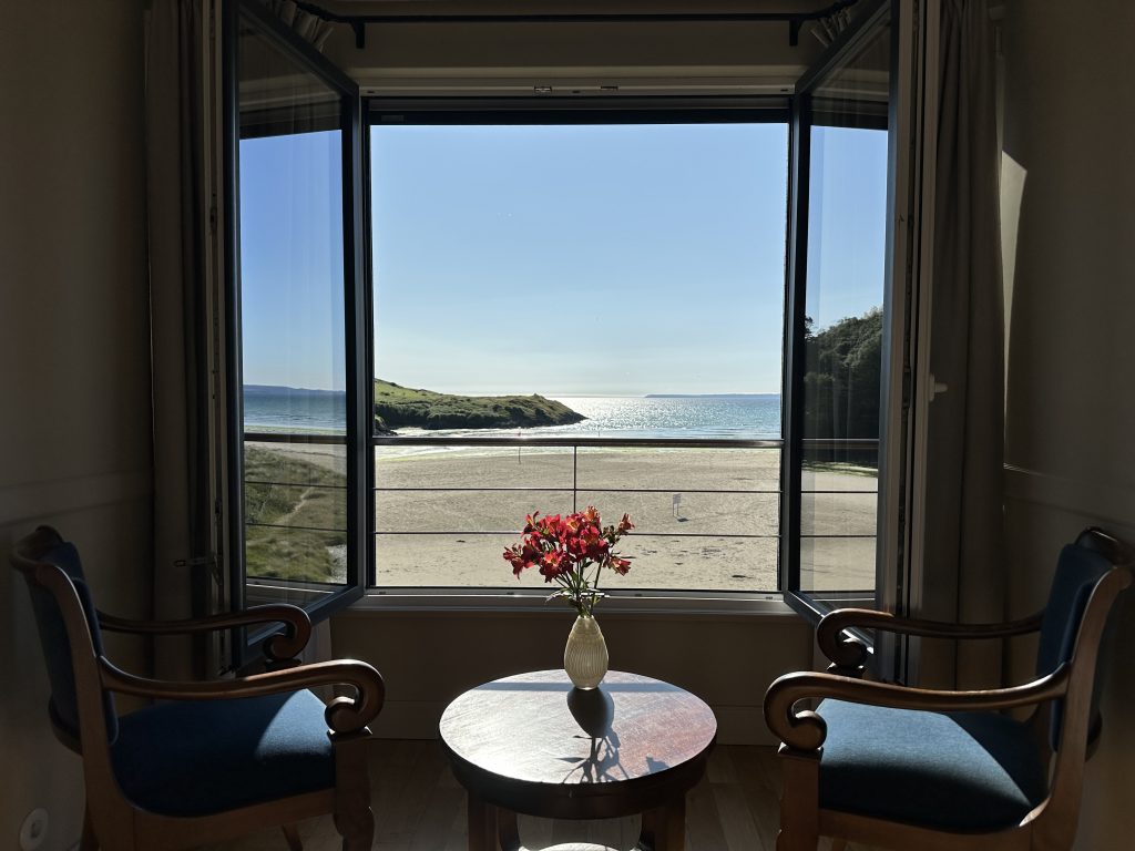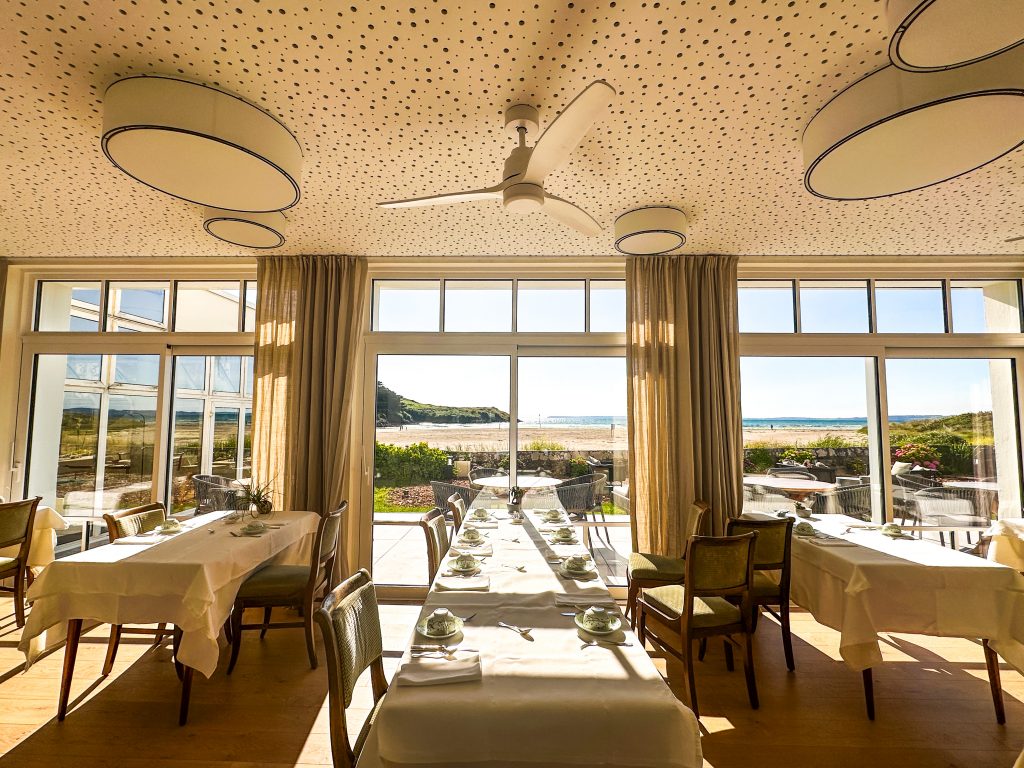 Le restaurant de l’Hôtel de la Plage**** est un des joyaux de cette maison centenaire. Avec l’océan pour horizon, la salle panoramique baignée de lumière devient le théâtre d’une expérience culinaire entre terre et mer à la fois élégante et profondément enracinée dans le terroir breton.