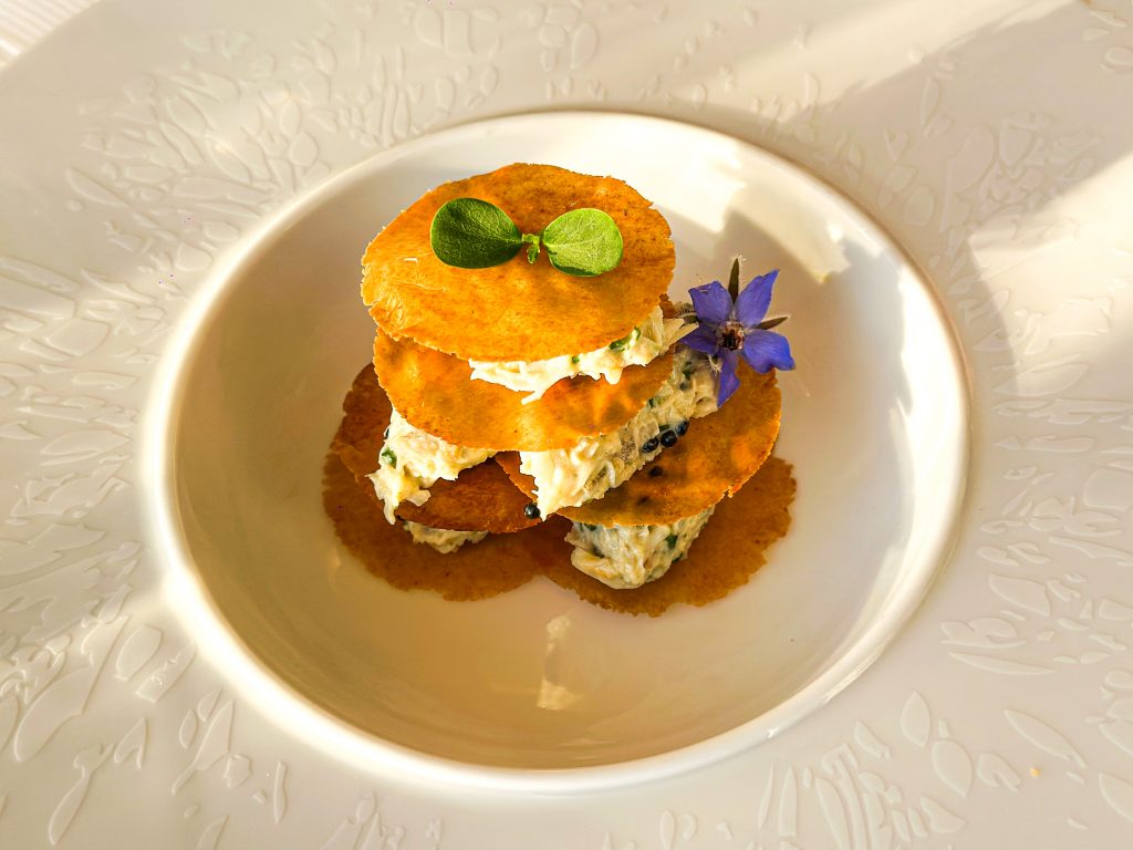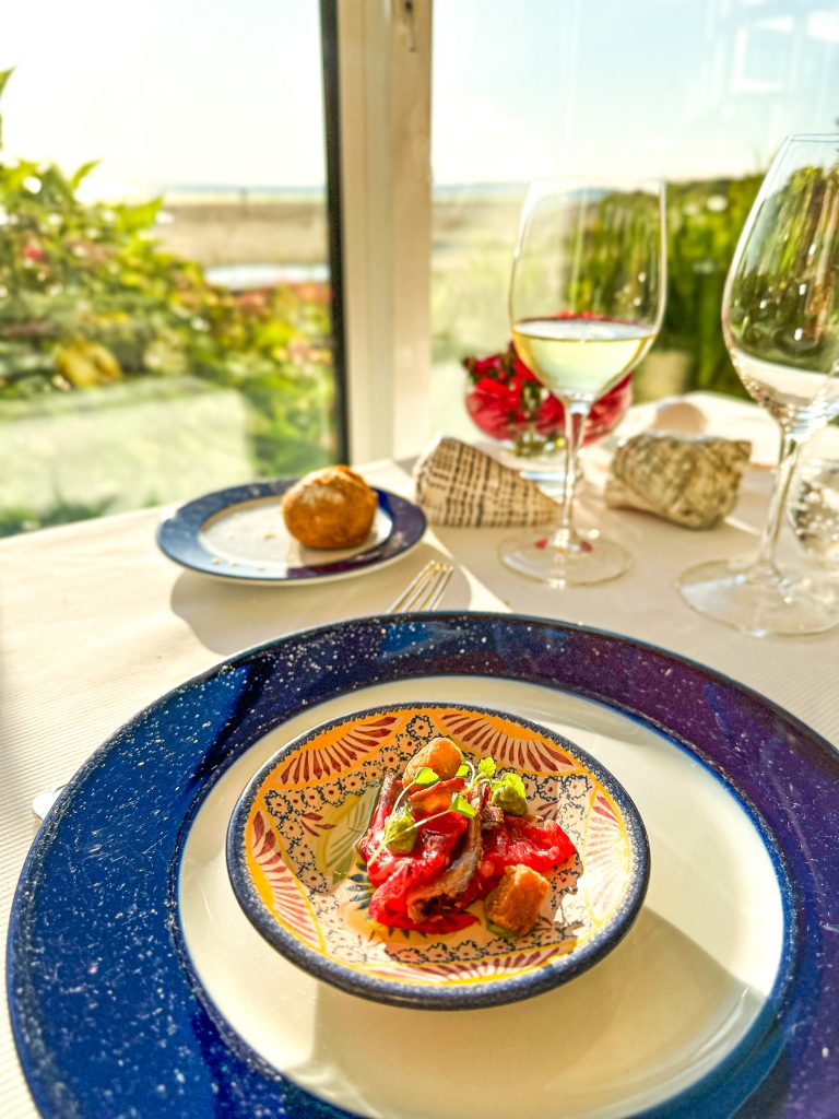 Confortablement installés face à l’océan, bercés par la vue imprenable sur la plage, nous doutons notre voyage gastronomique par une mise en bouche raffinée, un tataki de bœuf Matari accompagné d’un guacamole relevé, présenté dans la vaisselle élégante de la faïencerie Henriot de Quimper. Puis, la première entrée célèbre les saveurs marines avec de beaux ormeaux persillés de l’île de Groix, émulsion iodée, sucrine croquante et poireaux au lard, sublimés par un verre de Saint-Véran 2020 du Domaine Roux Père & Fils. Ensuite, la seconde entrée élève encore l’expérience avec un millefeuille aérien d’araignée de mer de la baie de Douarnenez, associé à un œuf de hareng fumé et paré de fleurs de bourrache.