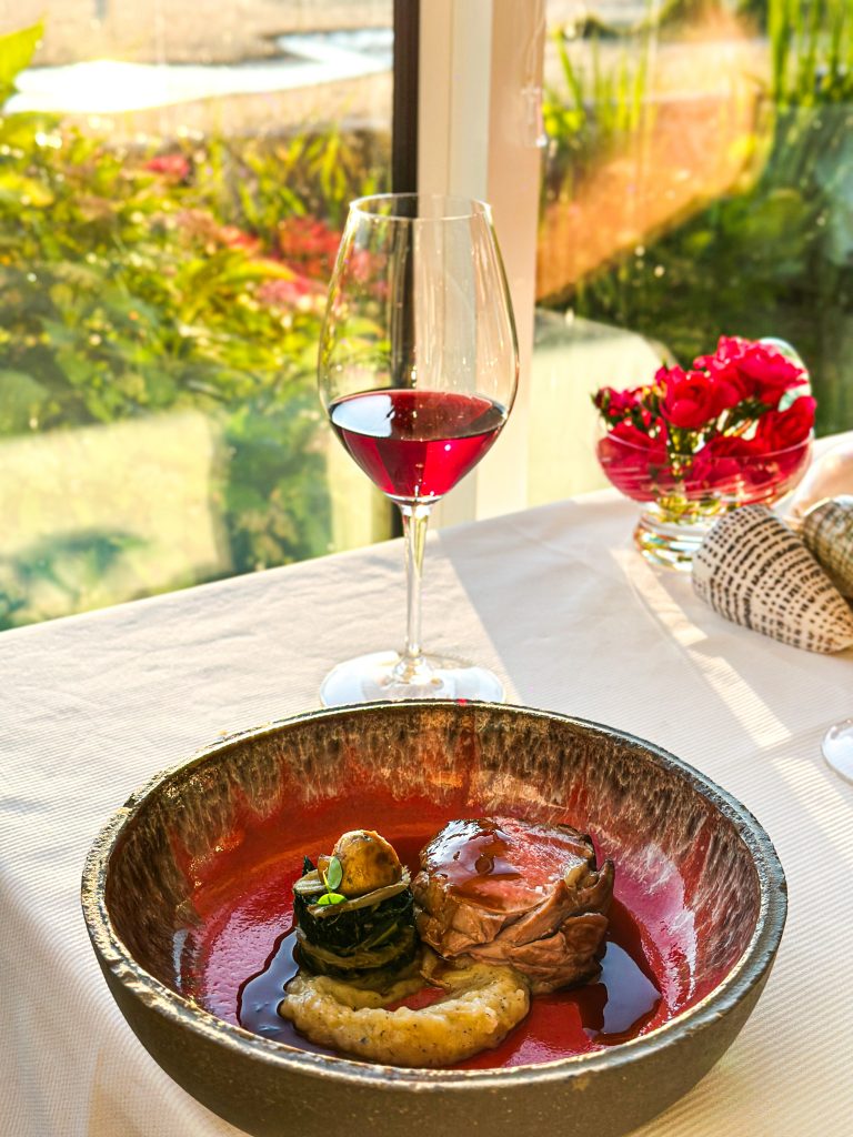 On enchaine avec un plat du terroir breton, un filet de veau tendre, accompagné de mousseline de pommes de terre ratte, jus court intense, millefeuille de blettes et truffes d’été. Nous le sublimons avec un Manetou-Salon 2022 du Domaine Isabelle et Pierre Clément.