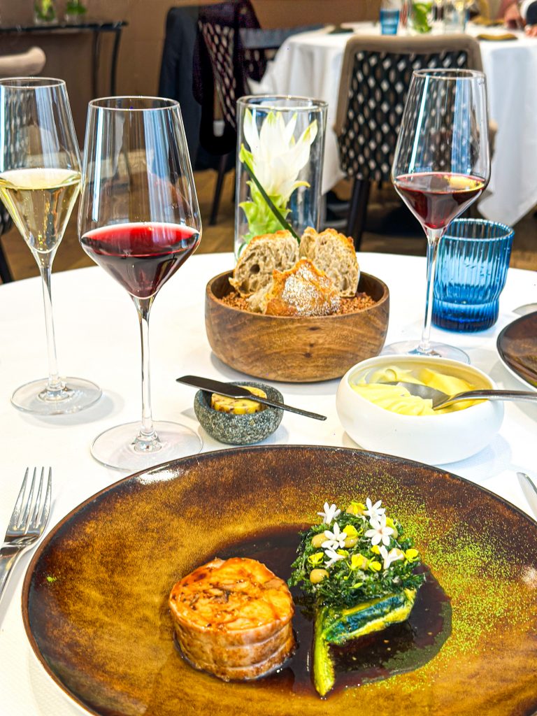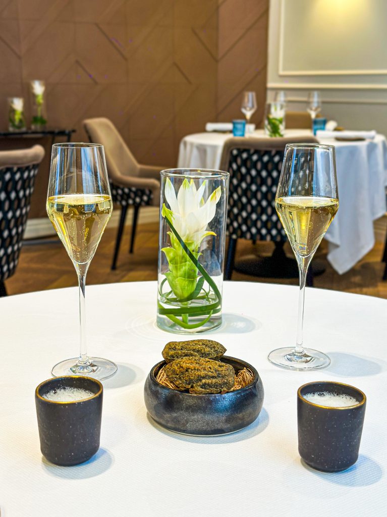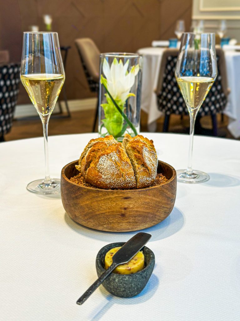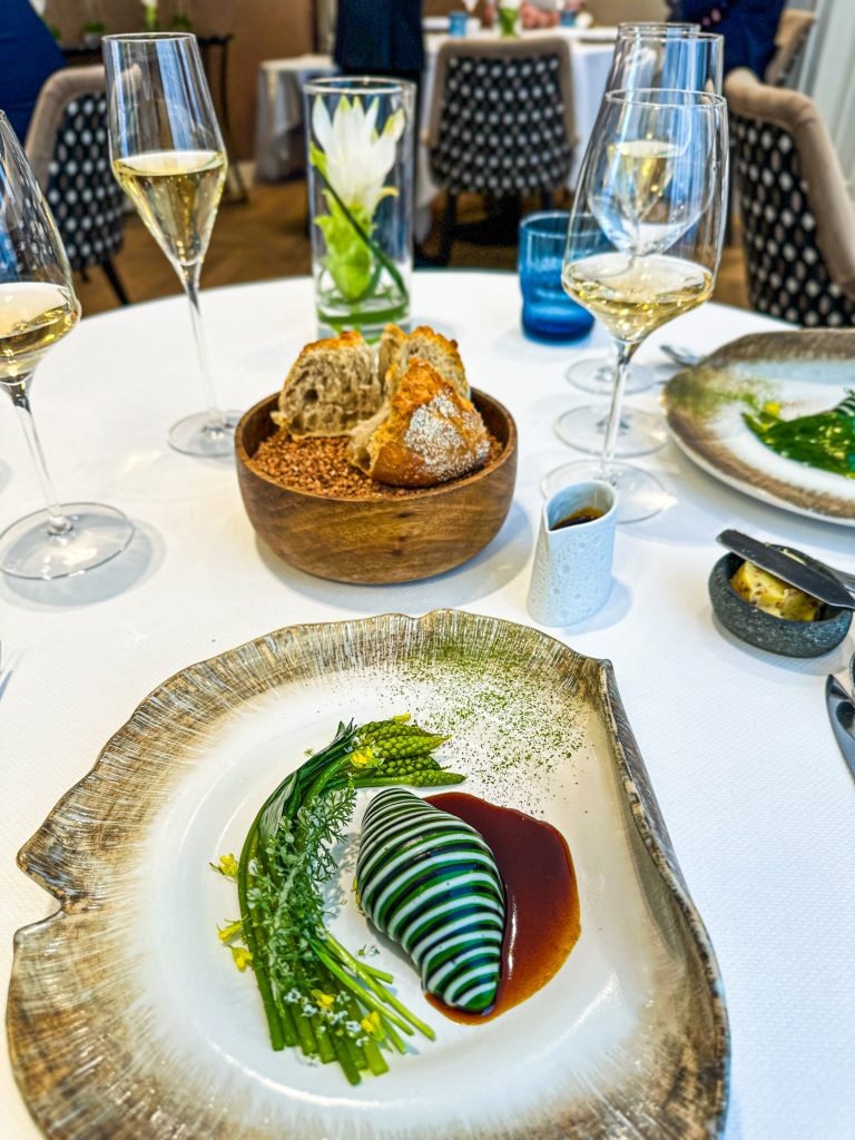 Confortablement installés, nous choisissons le menu déjeuner en trois services, prélude à une expérience tout en finesse. Deux coupes de champagne La Réserve Nature de Palmer & Co ouvrent le bal. Elles sont accompagnées de délicates mises en bouche, une royale de foie gras relevée d’une réduction de Porto rouge et d’une émulsion au parmesan, suivie d’une madeleine tiède aux olives noires et à la sarriette. En prélude au repas, le pain au sarrasin du MOF Frédéric Lalos, servi avec un beurre Bordier aux graines de sarrasin torréfiées, affirme d’emblée le ton de la maison alliant précision, élégance et respect du produit.