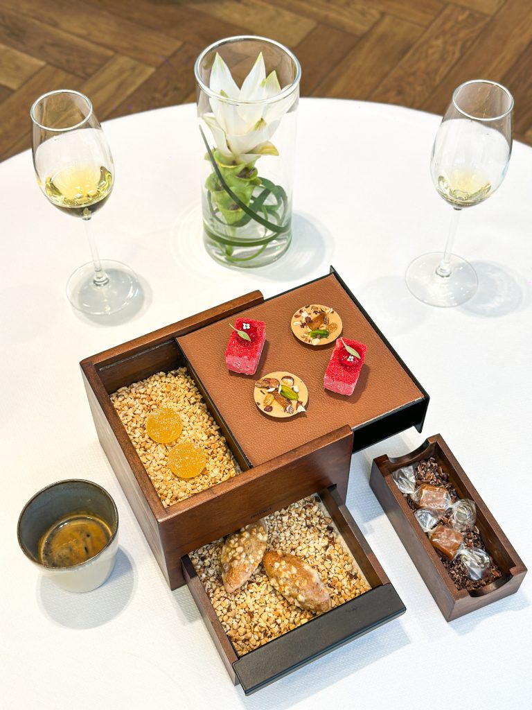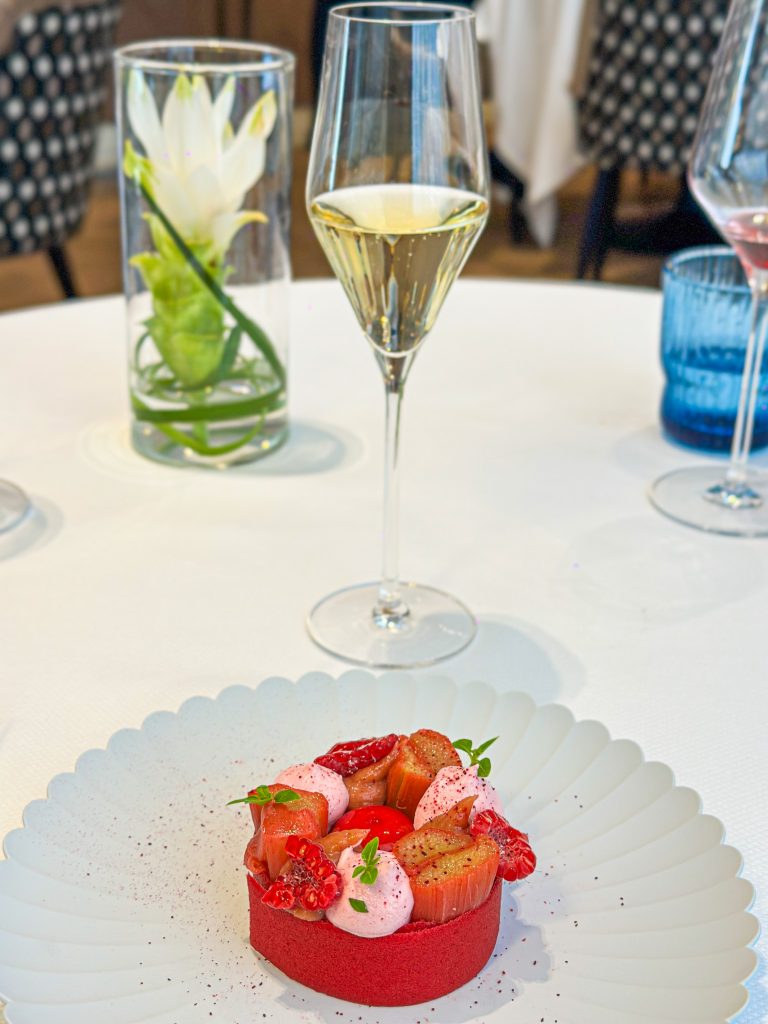 Vient ensuite l’instant sucré, signé du chef pâtissier Guillaume Levasseur. Sa rhubarbe fondante à la fleur d’hibiscus, accompagnée d’une meringue souple et d’un sorbet framboise, séduit par sa fraîcheur et sa précision d’exécution. L’accord avec un Jurançon 2021 du Domaine Cauhapé révèle une harmonie fruitée et élégante. En final, la valse des mignardises*, toute en finesse, conclut le repas sur une note régressive et raffinée.